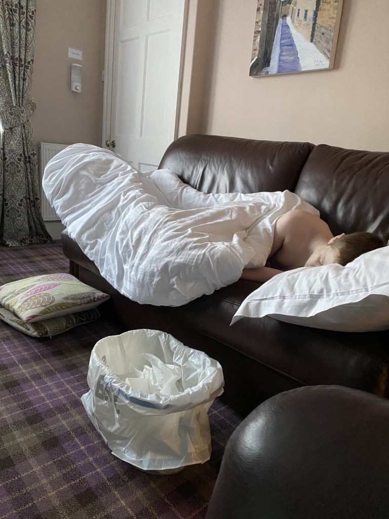 At approximately 2am, I was laid in a double bed with Squidge on a towel (he was still vomming every time he laid down for longer than 5 minutes) and T next to me with a bucket. J had gone downstairs to try to get some rest on the sofa. I was just nodding off, when I heard an almighty ruckus from across the landing…